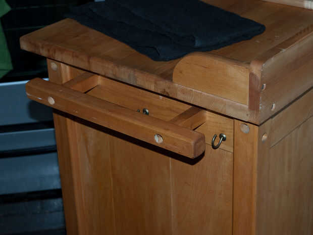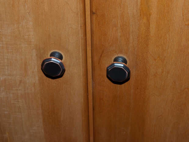 Ahora la superficie es todo teñido y engrasado es el momento de volver a colocar el hardware. las ruedas y las perillas deben reemplazarse con versiones agradables y limpias. El hardware debe todo vuelva a colocar en los agujeros viejos sin ningún problema.
