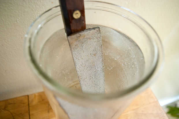 Lo primero que hago es conseguir eliminar el óxido en las cuchillas. Solía pasar mucho tiempo lijado el moho lejos, pero ahora solo hago una solución de ácido cítrico y agua para disolver el óxido. La ventaja aquí es que no se como abrasivo como lijado, que ayuda a preservar la marca del fabricante estampado en la hoja, y lo hará hasta eliminar el óxido en difícilmente alcanzar lugares.