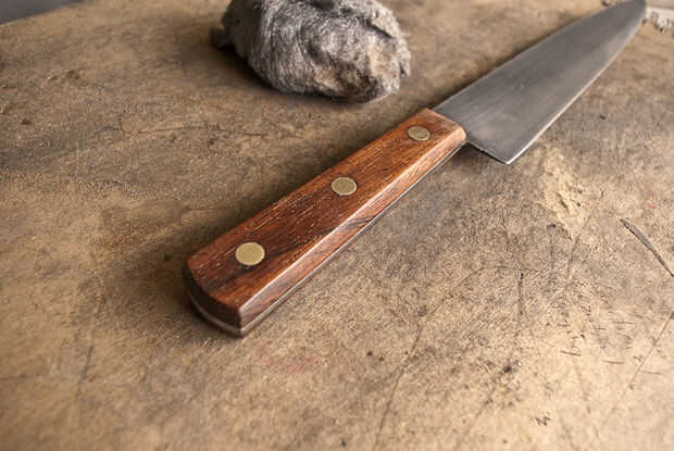 Después de que las asas se lija (junto con los remaches de metal y tang), está listo para el aceite. Normalmente uso unos abrigos de aceite mineral. Aceite de linaza hervido es otro buen acabado que realmente cura, por lo que no se queda tan mojado como otros aceites. Me gusta que le de alimentos seguros, pero es el cuchillo, así que ir con un acabado que te guste.