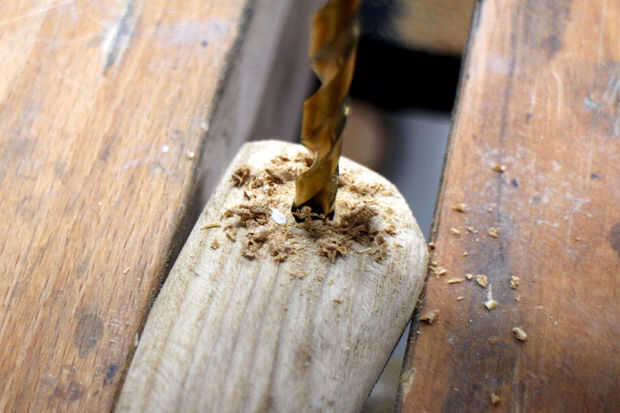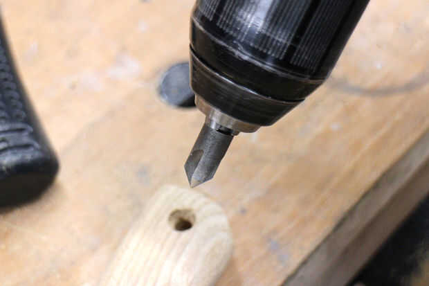 Quería que la opción de colgar mi martillo de un tablero de clavija, o atar algo al mango. Taladrar un pequeño orificio en la base de la manija, luego utiliza una broca de avellanar luego para suavizar la transición de agujero y ampliar la apertura.