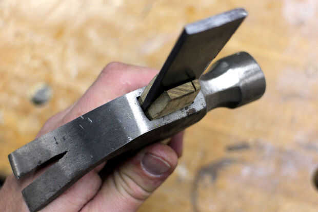 Proteger la manija de madera de daños con un trapo de la tienda, luego apoyo el martillo en un tornillo de banco y crear la cuña en el ojo del mango forzando el ojo aparte y manteniendo la cabeza al mango con fricción.