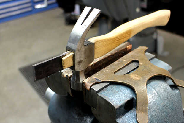 Con la cuña de acero bien martillado en el ojo y sosteniendo la cabeza de martillo en su lugar el exceso puede ser recortada. Uso de la amoladora angular recorte la parte superior del ojo y exceso de la cuña del martillo.