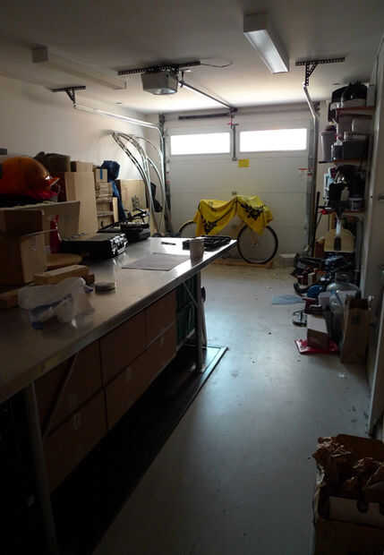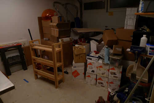 Espacio reorganizado, almacenaje de pared y mesa renovado y cargado completamente.