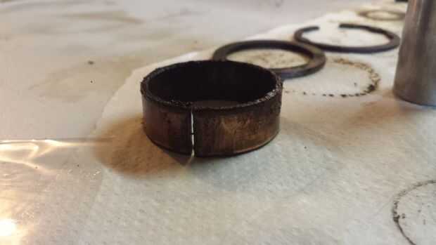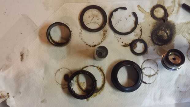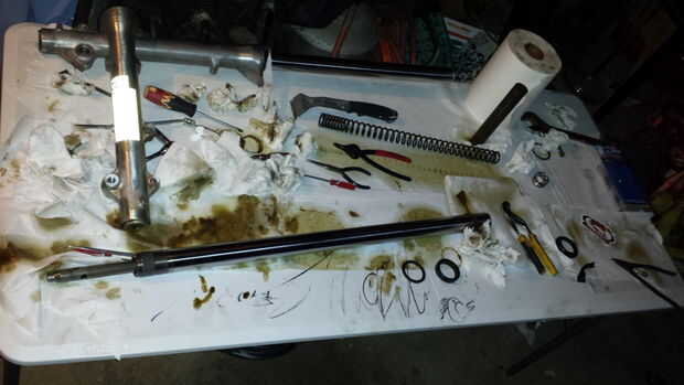Este proceso también será cubierto en un manual de la tienda. Para esta moto, empecé quitando el perno de drenaje de aceite en el extremo inferior de la horquilla, y drenar el aceite de la horquilla. Ayuda a apretar la válvula de aire en la parte superior para que el aceite drene más rápido. Luego quitar el tornillo en la parte inferior y quitar la tapa en la parte superior que contiene la válvula de aire. Tenga cuidado con esta parte, la tapa está bajo presión del resorte. Una vez, el espaciador, la arandela y el resorte caen derecho. Es un trabajo bastante sucio, así que usar algunas ropas viejas y tiene una estación de trabajo establecida. Siguiente, un flathead destornillador conseguirá la cubierta de la parte inferior de la mitad de la horquilla, y desliza sobre el tubo de la horquilla. Esto le da acceso a los sellos, que se llevan a cabo en lugar por algún tipo de clip. Eran un dolor para sacar en esta moto. Luego tirando hacia arriba el tubo de la horquilla varias veces, el sello debe saltar y todo debe desarmarse. Cuando un buje se muestra en la imagen. Se puede ver el revestimiento de teflón ha usado y necesitan reemplazar. En este punto, limpiar sus piezas y no salen las horquillas inferiores así que tenemos una superficie limpia para comenzar con.