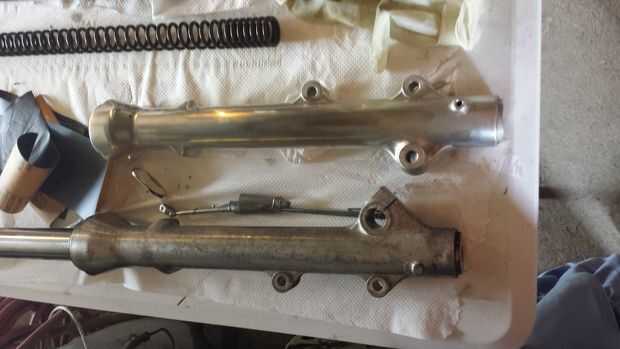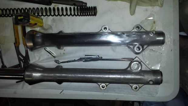 Arena, la arena y la arena más. Comenzó con una lija de 180 y luego caminó 1000 600.800 y mojado o seco 400. Mantenga las horquillas bastante húmedo al hacerlo. Inmediatamente notará una gran diferencia. Tómese su tiempo y hacer un buen trabajo, ya que es lo que determina qué tan bien las horquillas se ven cuando termine. También, usar una mascarilla y guantes de lijado de aluminio, los productos químicos liberados son cosas bastante malas, y no desea en toda su piel, o en los pulmones. Seguridad primero.