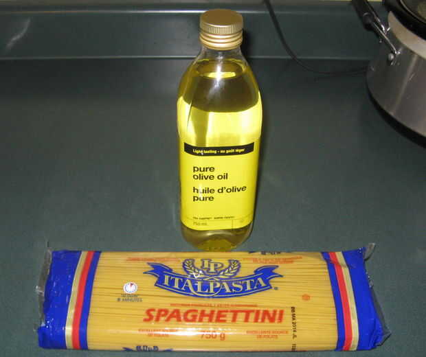 Tomar una olla grande de agua y que al calor añadir una pizca de sal y 1/2 taza de aceite de oliva. Cuando el agua comience a hervir agregar el paquete de 750g de pasta que lentamente esto permite que el aceite de oliva cubrir la pasta y evitar que se pegue mientras se cocinan.