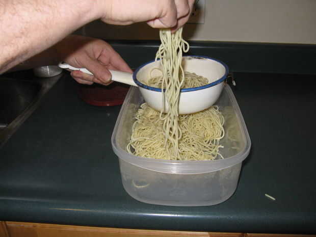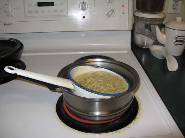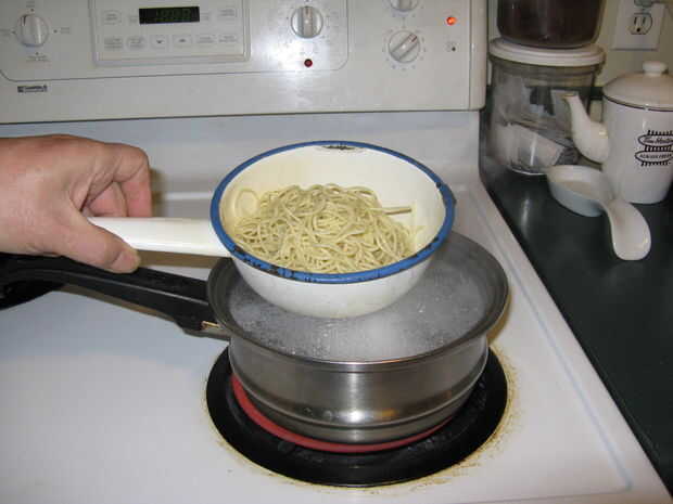 No hay microondas en su cocina a una olla de agua caliente, tomar la pasta fría y coloque en un colador o filtro y colocar en una olla con agua hirviendo. El agua dejará de hervir por unos 30 segundos, cuando el agua hierva otra vez su pasta está caliente y listo para servir.