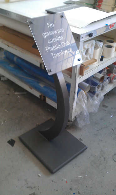 La muestra cuenta con placas intercambiables de acrílico con cosas como "Por favor espere a estar sentado" y cosas así.