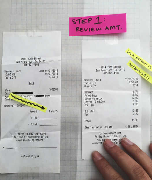 A menudo no tienen un recibo (mostrado a la derecha) después de procesar su tarjeta, así que sólo voy a la cantidad de impuestos de correos. Técnicamente no tienes que incluir impuestos en sus cálculos de punta, pero siempre me siento mal cuando no lo hago y sin un recibo que es difícil de quitar.