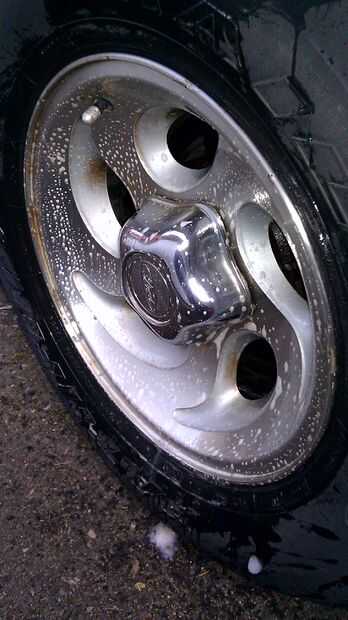 Después de fregar los cuatro neumáticos con las pastillas de jabón de aluminio, enjuague con un balde de agua para cada neumático (o con manguera si más fácil o más accesible para usted).