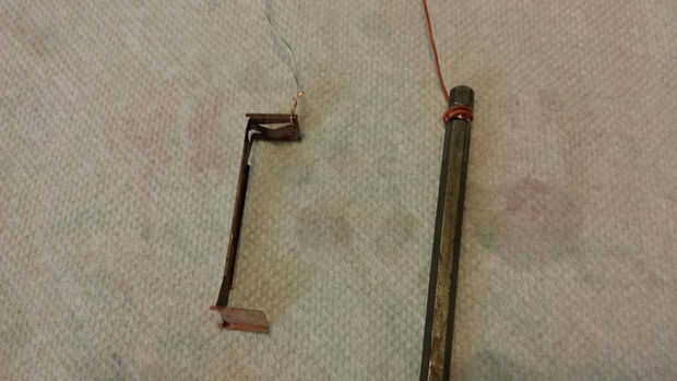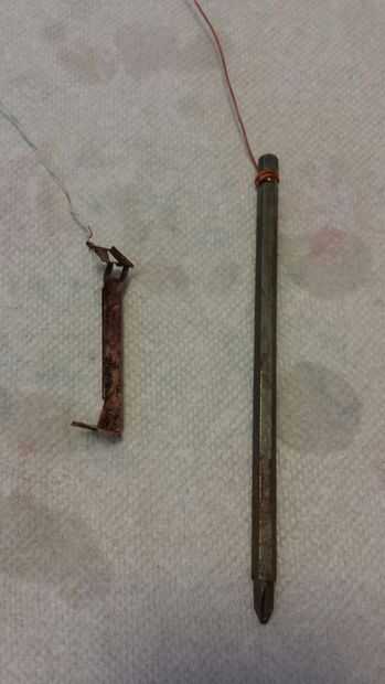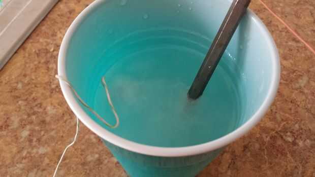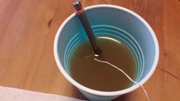Tomé otra taza de plástico y lleno de agua caliente y un poco de bicarbonato de sodio (algunos dicen bicarbonato no funciona, pero definitivamente lo hace). Me envuelve un poco alambre UTP fino alrededor del extremo de un destornillador barato y pegado en la taza para ser mi electrodo de acero/hierro.