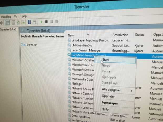 Høyreklikk på "LogMeIn Hamachi..." og velg "Start" (se bilde).