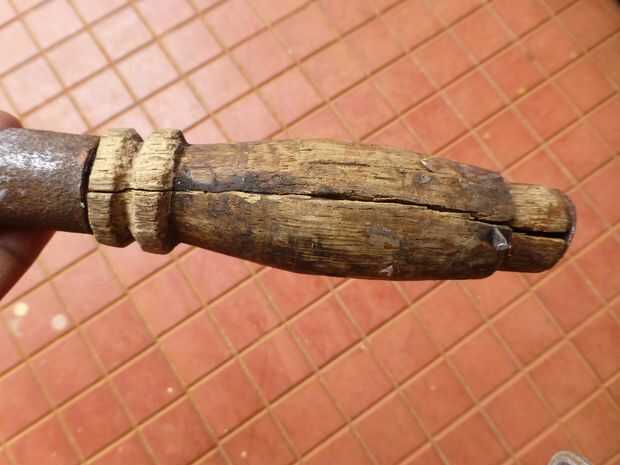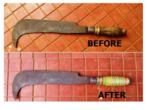 He intentado restaurar el mango con cinta aislante pero no lo ayuda ya que no había ningún agarre adecuado. Se ha dejado sin usar por un largo tiempo, así que pensó en restaurar el mango usando bandas de goma. Para mi sorpresa, éste resultó agradable con buen agarre y facilidad de uso. Pasé sólo una fracción del costo de uno nuevo. La manilla con bandas de goma, dispones de una buena protección en la palma de lesiones por astillas de madera en las grietas.