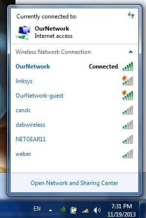 Clic en las cuatro barras al lado el símbolo de altavoz (esquina inferior derecha de la pantalla de Windows) y aparece este cuadro. Busque el nombre de tu red local personal. Nombramos nuestro "OurNetwork." Como se señala en el cuadro de texto superior, "Conectado" puede significar sólo el router está enviando una señal. No garantiza que el módem está alimentando una señal WiFi al router. Aún así, quieres ver la palabra "Conectado". Las otras cadenas pertenecen a nuestros vecinos. Generalmente están asegurados por una contraseña, así que no puedo simplemente conectar a sus redes.