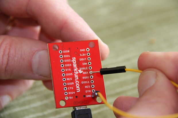 Ahora, haga clic en el botón write en el X-CTU. Debe dar un mensaje de error, pero no para hacer de éste. Voltee el XBee Explorer. Ahora, tome el cable de puente y toque RST (no RTS) al pin GND del explorador para aproximadamente un segundo. Quitar el cable de acoplamiento. El mensaje de error debería desaparecer! Comenzará a cargar el firmware. Una vez que el mensaje de error sale más, repetir el paso anterior. Ahora se ha restaurado tu XBee!