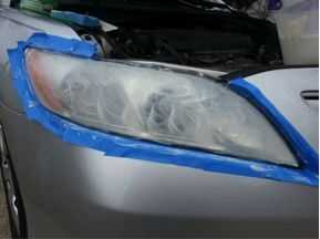 Mojar la almohadilla fregado y eliminar la mayor parte del agua. Se necesita más que húmedo, pero no goteando. Untalo pulido compuesto en los faros. Los "profesionales" le dirá que use un movimiento circular, pero realmente no hay diferencia. La razón para el movimiento circular es para que no te pierdas ningún puntos.