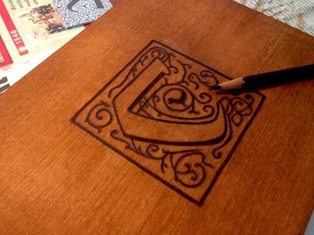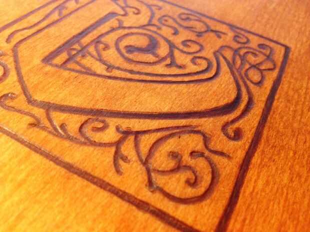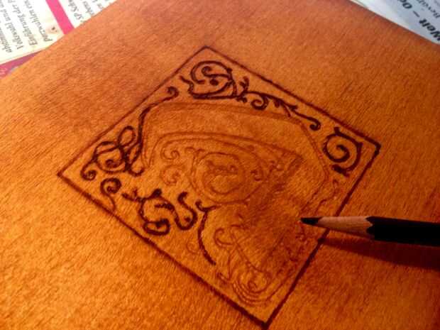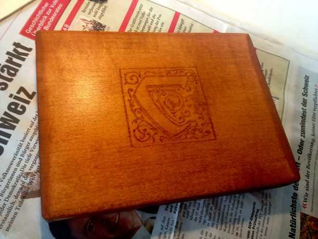 Utilicé una esponja para difundir la tinta para madera en la caja. Una vez que empieces a poner en, asegúrese de que hacerlo en una sola jugada, de lo contrario se verá feas fronteras de la mancha. Usted notará que el agua hace los surcos en el logo se hinche, disminuyendo el efecto de relieve. ¡Eso está bien! Porque tan pronto como haya terminado con la mancha de madera, tomar un lápiz acuarela (preferentemente marrón) y seguir los surcos de la insignia otra vez! Esto apretar el agua fuera de las ranuras y hacer la insignia más oscuro. Sus surcos son coloreado marrón bien oscuro y posterior. :) Esto es porque el lápiz acuarela es "disuelto" por la superficie húmeda en que se están pintando. Luego le dará un aspecto "quemado" de su logotipo que parece bastante cool que creo!