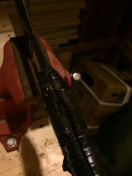 Por lo tanto, estamos reemplazando esta manija horrible. Usé un cuchillo justo afilé (instructable venir!) para cortar este asqueroso manija de cinta aislante. (Consegui esto de mi padre, llegó de quién sabe dónde, al igual que lo es).