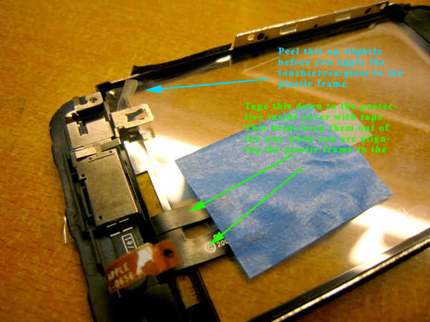 5) antes de aplicar la pantalla táctil/cristal Colóquese unos guantes de látex (a partir de ahora hasta que esté acabado) cáscara interior protector lejos de la pantalla un poco y cinta abajo de los cables (segunda foto)