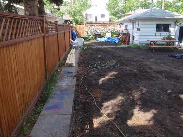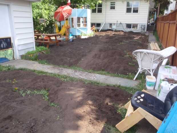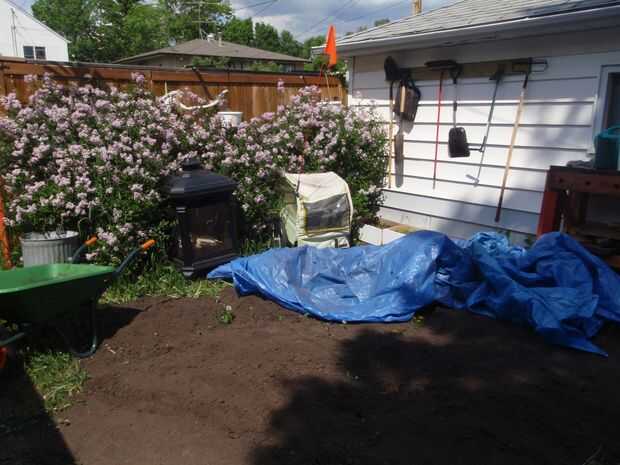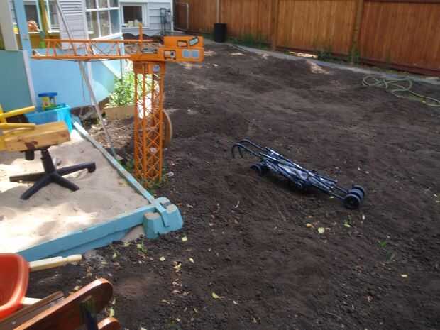 Luego utiliza una carretilla para transportar la suciedad en el patio y luego alisó hacia fuera con un rastrillo.