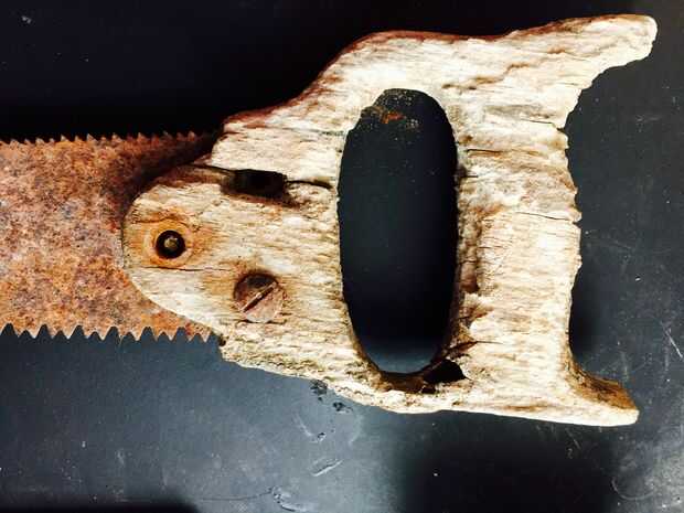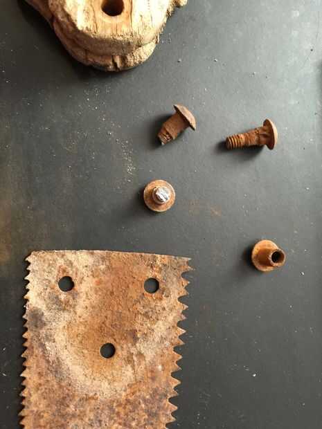 Retire el mango de la hoja de sierra. Era capaz de salvamento scew y perno, el otro fue cerrado oxidado y requiere una sierra para metales para el retiro. Pretendo rescatar el tornillo y el perno para demostrar la edad de la pieza. Si lo desea, puede reemplazar todos los tornillos.