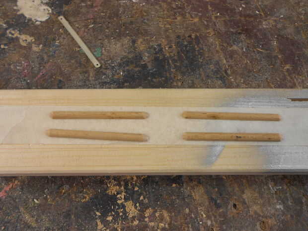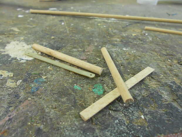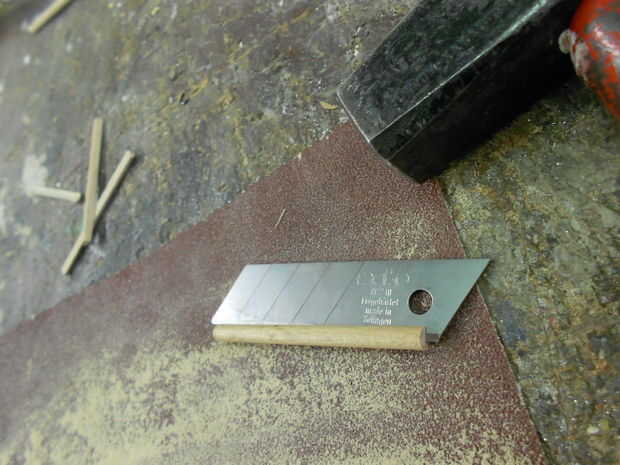 Para los lados quería algo fuera de la madera. He tenido unos 5mm pasador izquierda del paso anterior. Así que les corte a la misma longitud que las tiras de espejo original. Luego partí a la mitad longitudinalmente con un cuchillo y un martillo (tenga cuidado en eso), les lijado plano y redondeado de los extremos. Para preparación de pintura me pegado en alguna cinta de pintor fijo un trozo de madera.