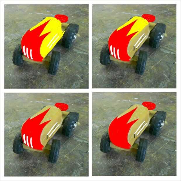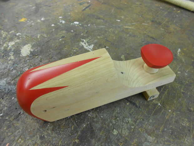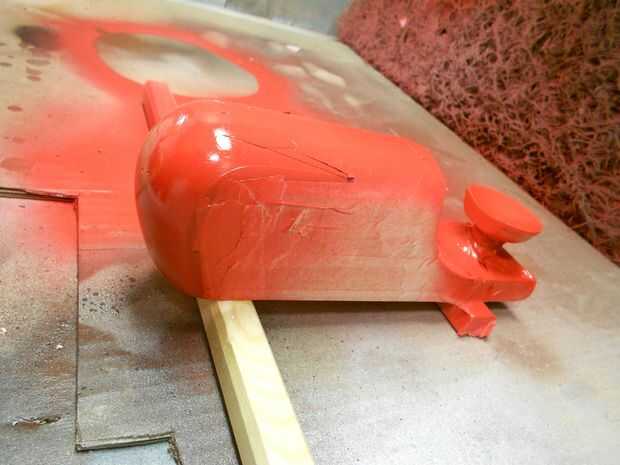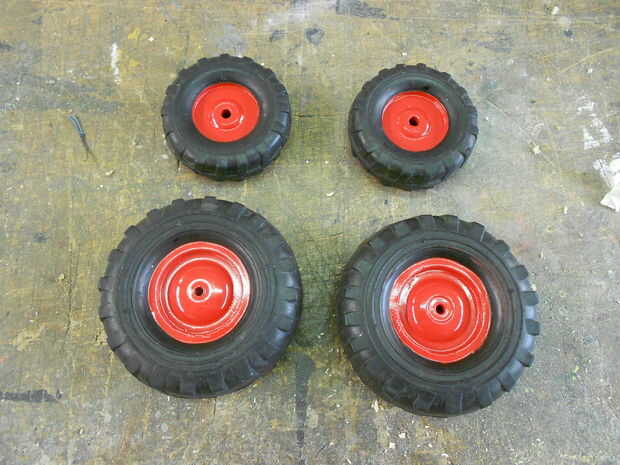 La capota del tractor tiene varias capas de rojo, así como el asiento. El volante pintado de negro, las luces y decoración tiras de plata. Las ruedas tiene una capa de imprimación plástico primero, en la madera y metal no usé ninguna cartilla.