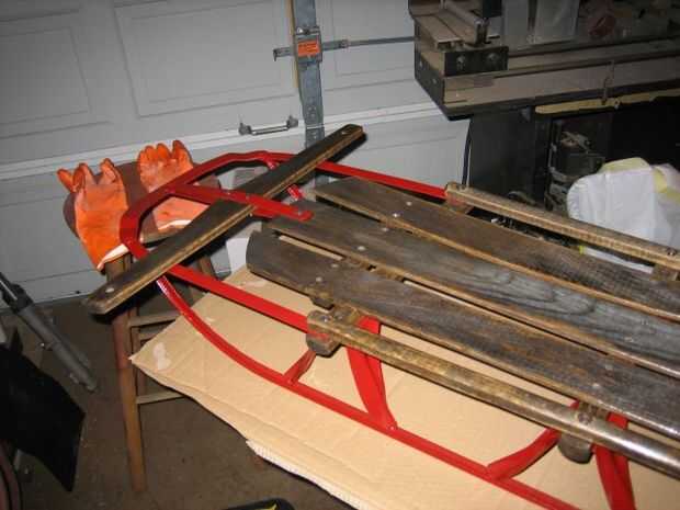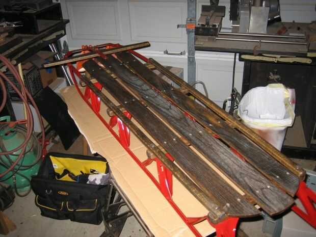 Después de que la pintura había curado, vuelve a montar el trineo con los pernos de carruaje para unir los travesaños y tornillos para madera para sujetar las tablas largas a los contratiempos. Antes de instalar los pernos y los tornillos, usé un oxidante de metal (arma azul) para que parezcan viejos.
