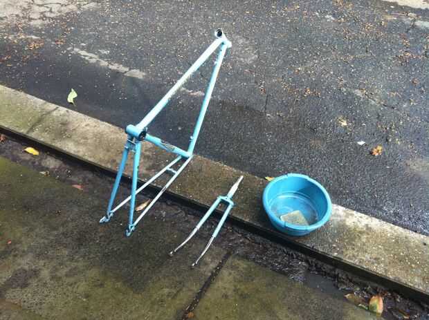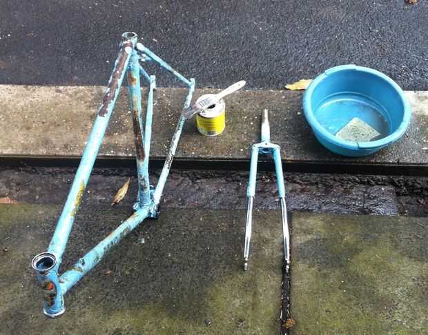 Este paso es un dolor absoluto. Llevará cuatro o cinco horas como mínimo y puede ser mejor gastar un poco más y conseguir a alguien para chorro de arena y pintura polvo del marco.