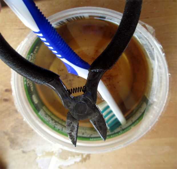 Después de un día, buscar en la herramienta.  Debe ver mucho de escamas de óxido y suciedad en la solución.
