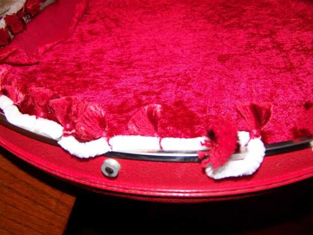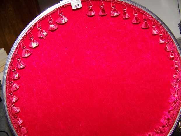 Yo recorría las borlas con limpiadores de pipa y metido los extremos del limpiador de pipa en el labio externo del borde de la maleta. Esto sostiene los tassles de mi camino mientras yo me recorte el trazador de líneas y pegar debajo de la moldura.