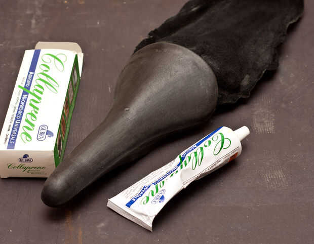 Para pegarla he usado un pegamento neoprenic. He añadido pegamento a la carcasa de plástico y luego la cubrí con el cuero y pegamento era un poco viejo, así que se seca muy rápido, y no se adhiere muy bien. Por lo que está extendiendo mucho mejor pegamento sobre superficies y espera que seque y cerrar la tapa tirando muy apretado. Con estas colas es buenos vencer a las dos superficies después de pegar para hacer una Unión más fuerte.