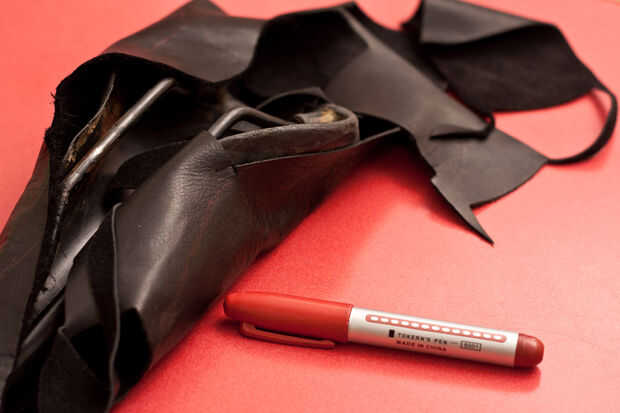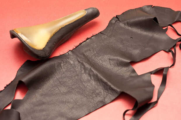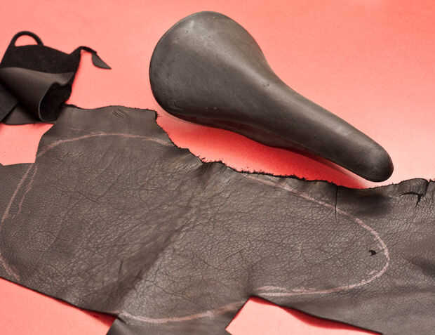 Como cuero utilicé una pieza inútil que obtuve gratis. Podría se utilizado el revestimiento original para obtener la forma correcta. La otra solución es la silla de montar con el desecho de cuero y marcar con un lápiz la frontera, considerando aproximadamente una pulgada de margen.
