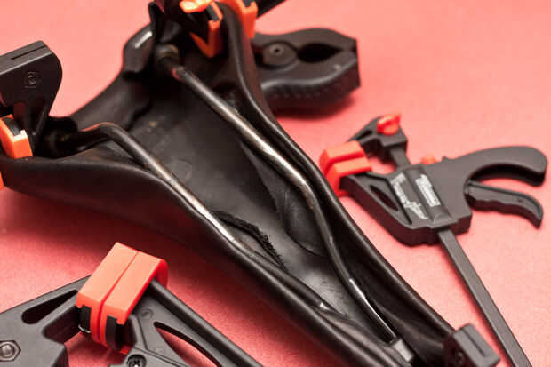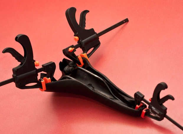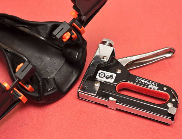 Para bloquear el cuero en su lugar y evitando que se encogerá, utilice algunas abrazaderas. Si encuentras las abrazaderas arruga-libre es mucho mejores, ya que no deja marcas en la piel seca.