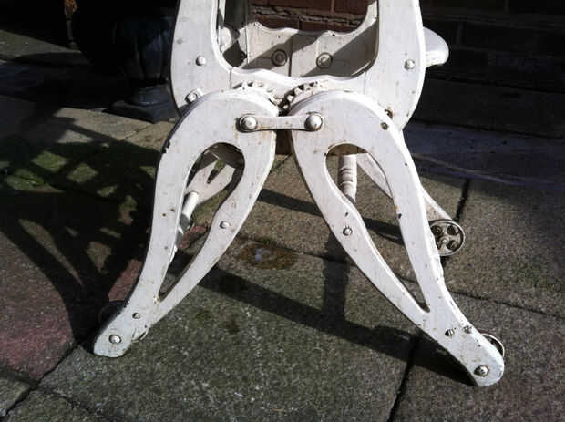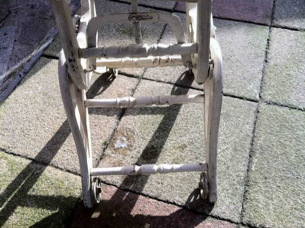 No hay ningún truco rápido (que yo conozca) para quitar la pintura. Utilizar removedor de pintura y grasa de codo. Tomó mucho de raspado, lijado y hardwoork. Yo continué hasta que fue completamente hasta la madera pelada y todo de la pintura fue quitada. Limpiar todas las piezas de metal también. Me aseguré que fueran libres para moverse ya que la pintura había dejado la silla de plegamiento en la mecedora.