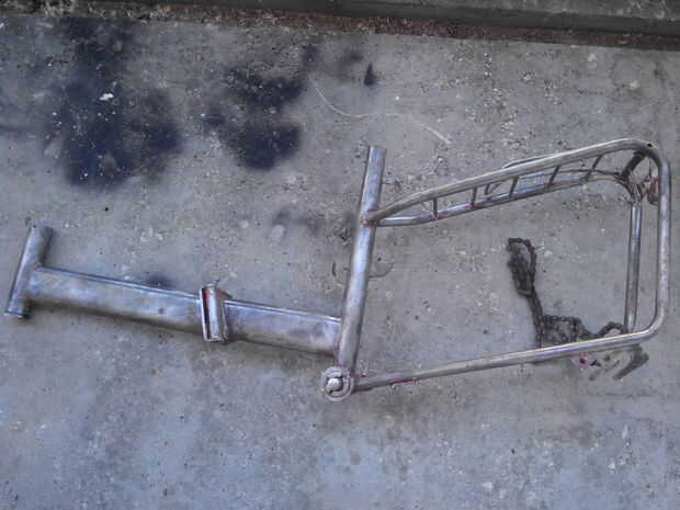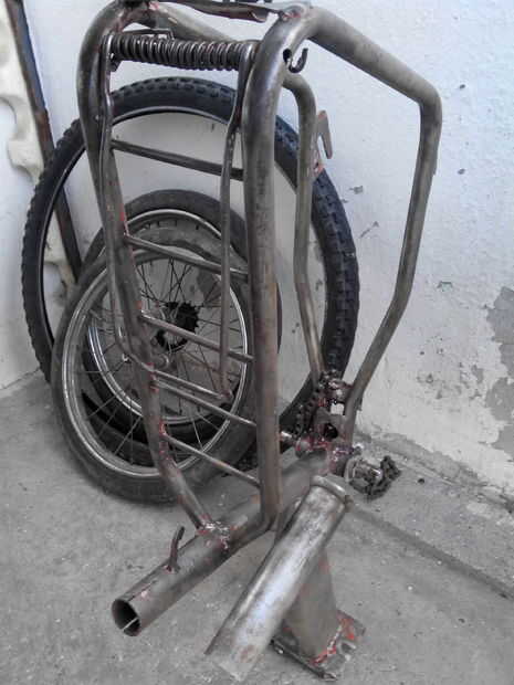 Paso 1: a partir de una vieja bicicleta - tira todos los extras (roturas, defensas, caballete etc..)Paso 2: una vez que tengas la moto desnudo huesos Quite todo pero el triángulo traseroPaso 3: utilizar un neumático auto cuerpo sierra o sierra para m