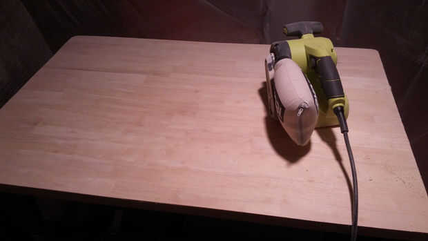 Una lijadora con papel de grano 80 había alisada la superficie. Porque hubo una tormenta de nieve y no tengo ningún garaje creé un cuarto limpio con el plástico de los pintores y había sellado. Era como una tormenta de arena dentro, pero contuvo todo el polvo, manteniendo impecable el ambiente circundante.