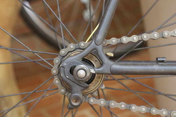 * Importante: Asegúrese de que el cuadro tiene "salidas horizontales", que significa que las ranuras que sujetan el eje de la rueda trasera son más o menos en un plano horizontal. Esto permite movimiento hacia adelante y hacia atrás de la rueda para ajustar la tensión de la cadena, que es necesaria para evitar que la cadena resbale. Por otra parte, ahora es un centro especial que se puede comprar si tu marco tiene "salidas vertical". Este hub permite algunos ajustes horizontales para la cadena de tensión (http://sheldonbrown.com/harris/white-hubs.html)