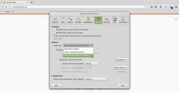 En primer lugar, vamos a configurar la configuración de privacidad en Firefox. Seleccione el menú en la parte superior derecha y luego preferencias. En la pestaña 'Privacidad', puede configurar Firefox para navegación privada (seleccionando el menú desplegable 'Usar una configuración personalizada') de forma predeterminada. Esto significa que las cookies no son salvos, y tampoco lo es su historia (aunque puede utilizar la gota de configuración personalizada para hacer que hacer lo que te gusta en esta zona).
