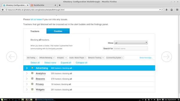 Una vez que has ido a los complementos y lo instalamos, después de un reinicio de Firefox que se a traído al Ghostery recepción y asistente de configuración. Esto le permitirá elegir lo que seguidores potenciales para bloquear. En mi caso, he decidido bloquear todo. En la cantidad justa de tiempo he estado utilizando esta herramienta, no he encontrado para causar problemas excepto la desactivación ocasional de un widget (pero es fácil temporalmente volver a activar).