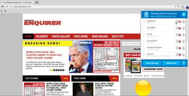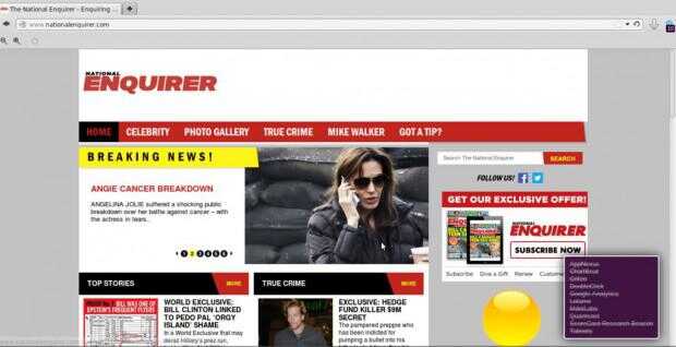 Por ejemplo, he decidido visitar un sitio que pensé que podría tener el tipo de cosas que podría rastrear personas o conseguir analytics, el National Enquirer. Por favor no que no estoy recogiendo en este sitio en particular--seguidores a menudo son utilizados por sitios para averiguar lo que buscan personas en un sitio y similares. Casi todos los sitios tendrán un par.