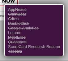 A cerrar en los trackers Ghostery encontrado aparecen en la parte inferior derecha. Como ya he contado Ghostery a bloquear todo, se puede ver que todos los seguidores potenciales han sido cruzados, para demostrar que has sido bloqueados.