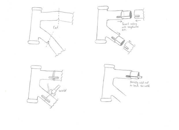 El daño fue casi exclusivamente en el marco de la bicicleta. El tubo superior y abajo el tubo eran ambos profundamente arrugadas. La rueda delantera sólo tenía un ding menor que yo probablemente podría han fijado, pero desde que tuve un repuesto, decidí dedicar mi atención a la estructura. Puesto que era un marco antiguo, de acero que sólo podía cortarlo por la mitad, bang a las abolladuras y soldar con autógena detrás junto, bueno como nuevo. Corte el marco podría comprometer su resistencia, así que se soldar con autógena un pedazo de tubo de acero interior para mayor rigidez. Esta solución podría trabajar para otros metales, como aluminio y aleaciones, pero tendría que ser o conocer un soldador muy hábil. El acero es a menudo mucho más fácil trabajar con.