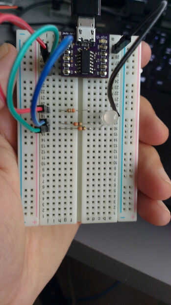6. Conectar el tercer pin de conducido al puerto de módulos C1 sobre una resistencia de 330R. (Opcionalmente con el cable de puente verde)