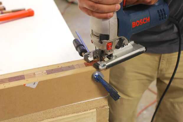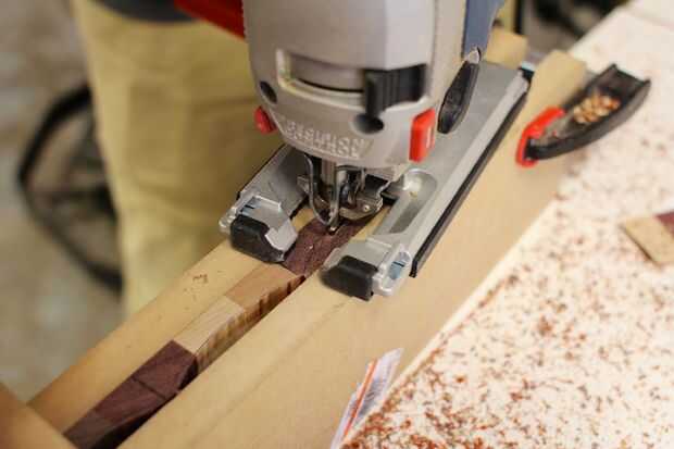 usé una sierra caladora cortar la forma del perfil bosquejada en el paso anterior.  Abrazadera de dos piezas de madera sacrificio a cada lado de la población a apoyar, dar la base de la Sierra de vaivén una superficie más estable y elevar la plantilla del disco por encima de la mesa de trabajo.