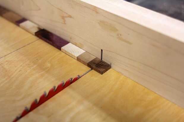 Cortar una tira fina del material de madera del arco iris (tenía este estrecho stip ya ahí) en la Sierra de mesa.  Luego, usando un trineo del crosscut para la Sierra de mesa, corte finos cuadras tira para convertirse en los pies para el palillo descansa.