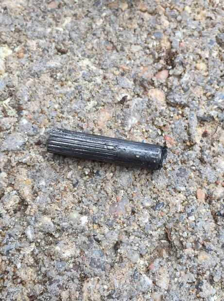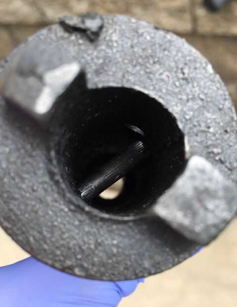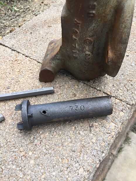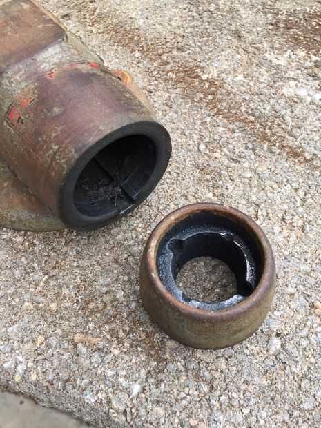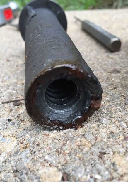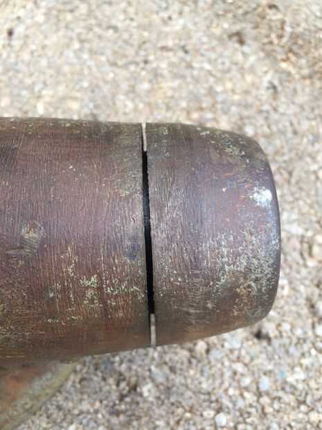El siguiente paso es un poco complicado y requiere de algún ensayo y error. Originalmente, intenté quitar la tuerca de la mordaza retención de pernos (#9) primero, pero encontró que no era ideal. Mediante un camino de clavija de madera de pequeño diámetro pegado por la abertura de la mandíbula posterior (#8) y el centro de la tuerca de la mordaza (#11), aprovechado la tapa suelta. ¡Ten cuidado! Mina tiro unos 30 pies cuando vino suelto, pero que no fue dañado.