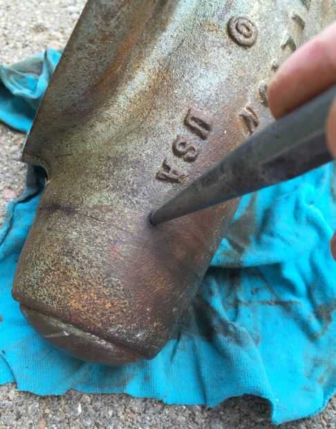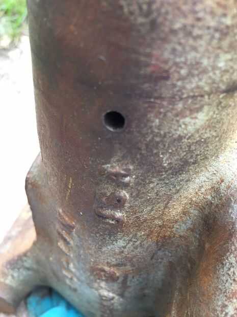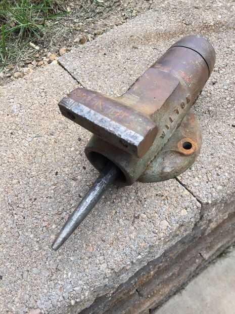 Luego, utilizando un punzón de acero, condujo hacia el centro de la mordaza de retención pernos (#9) en la tuerca de la mordaza. Si no puede ver las clavijas claramente, usar un cepillo de alambre para remover pintura o acumulación hasta que vea claramente. Estos pasadores mantener el tornillo tuerca vivienda (#10) y tuerca de tornillo (#11) en su lugar. Cuando hice este paso, el primer vino de pin flojo y cayó hacia fuera y el segundo pin tiene enclavada dentro de la tuerca de la mordaza (dentro de la mandíbula posterior). Tienes el perno pegado desalojado por primeros golpeando ligeramente la tuerca de la mordaza de la parte posterior de la mandíbula posterior (donde estaba el tapón) y luego utiliza un punzón de acero (empujó a través del agujero donde la hermana del perno estaba en el otro lado de la tuerca del tornillo de banco) para conducir el perno pegado hacia fuera desde el interior de la mordaza tuerca , nuevamente hacia afuera a través de él es agujero original.