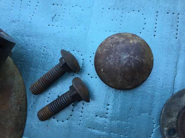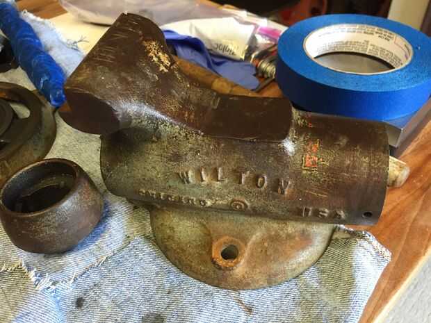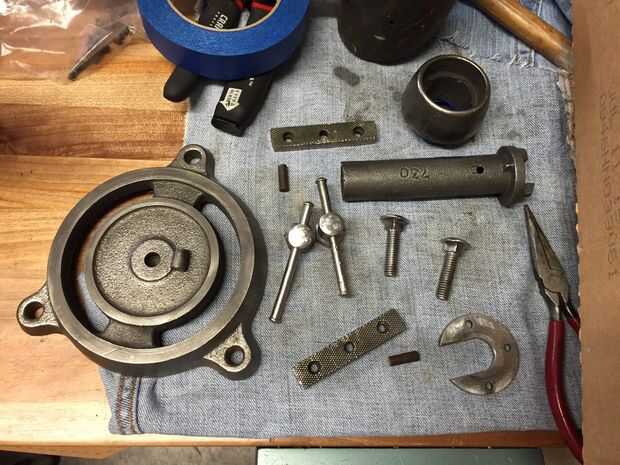 Finalmente, vino la saga de los tornillos de la cuatro cara (#6) sobre las placas de cara de dos mordazas (#7). Después de lavarlos lo mejor que pude con disolvente y un cepillo de alambre, di cuenta que había ninguna superficie utilizable para poder salir. Un extractor de tornillo pelado consiguió tres out, pero el número cuatro no cedía. Cuento largo, un maquinista local y $20 consiguieron número cuatro hacia fuera. Cuatro nuevos 10:32 tornillos de cabeza hueca fueron comprados para reemplazar los tornillos viejos.