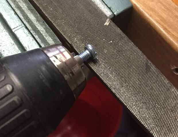 - Los tornillos de repuesto que compré para la lavadora de herradura necesitan modificación. La cabeza del tornillo era demasiado amplia y frotado contra la manivela del husillo. Para solucionarlo, me reprimieron un archivo de hierro en mi banco y luego utiliza mi taladro inalámbrico (con un tornillo en lugar de un poco) para moler poco a poco por el diámetro de la cabeza del tornillo. Tuvo algunos trabajos, pero finalmente lo conseguí para todos los tres tornillos.